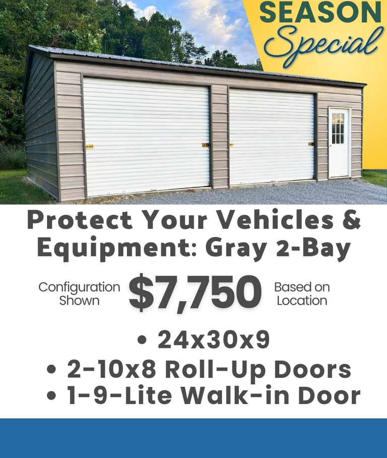 Secure your cars, trucks, or heavy equipment in this robust 24x30x9 building. Featuring two 10x8 Roll-Up Doors for wide access and a 9-Lite Walk-in Door, it’s the ultimate solution for protecting your investments from the elements.