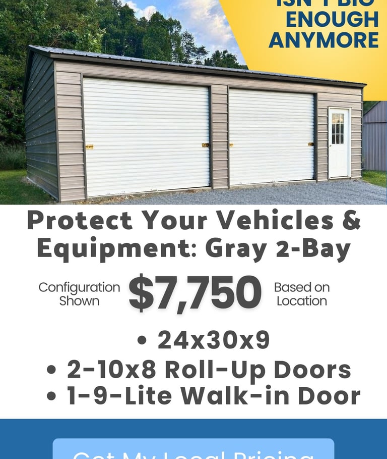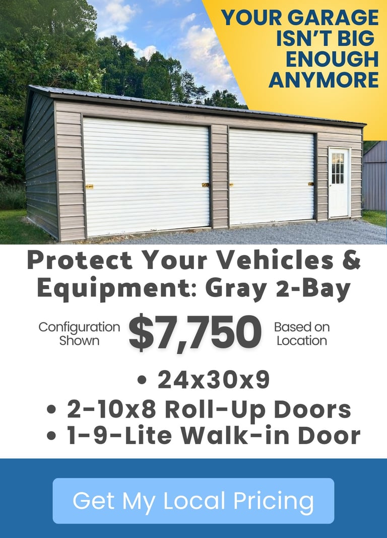 Secure your cars, trucks, or heavy equipment in this robust 24x30x9 building. Featuring two 10x8 Roll-Up Doors for wide access and a 9-Lite Walk-in Door, it’s the ultimate solution for protecting your investments from the elements.