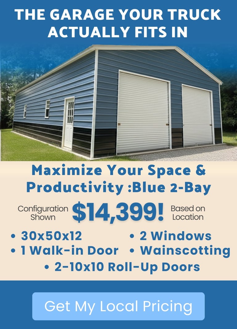 Unlock serious potential with this expansive 30x50x12 structure. Ideal for large workshops or commercial storage, its two oversized 10x10 Roll-Up Doors and functional design are engineered to boost your productivity and provide long-term value. Build bigger, achieve more.